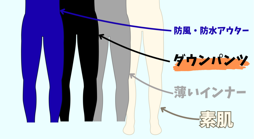 「ダウン」とは、その名の通り、ダウン(羽毛)を使用して作られたパンツのことで、特に寒い環境下での防寒対策として使用されます