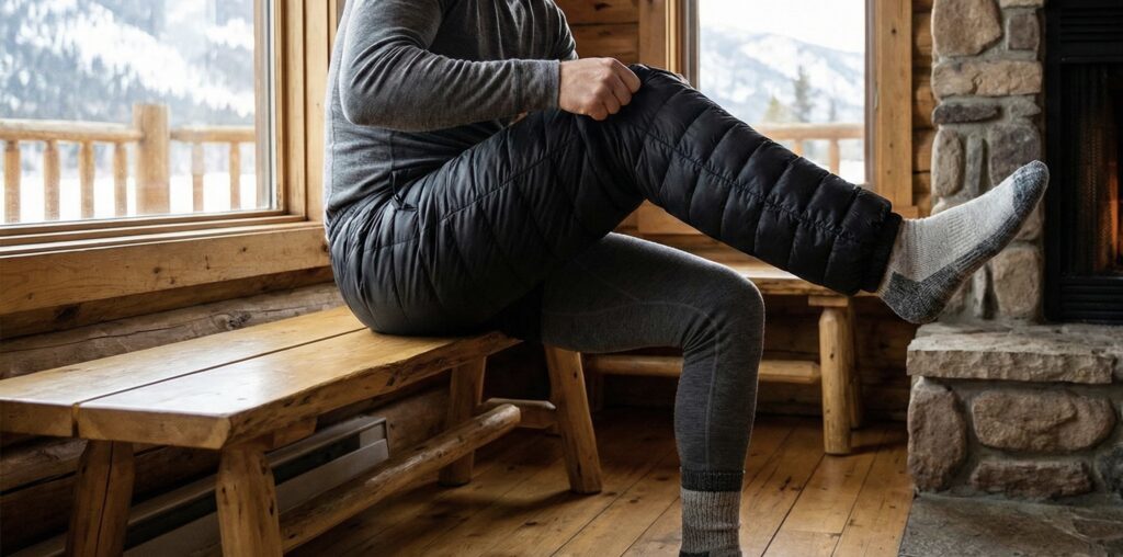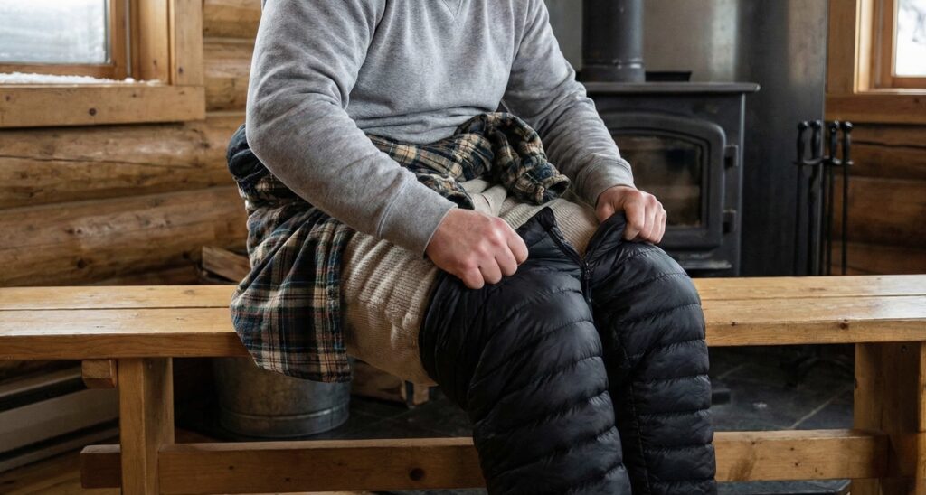素肌に直接ダウンパンツが触れないように、適度に体温を通す薄手のインナーパンツを着用してからが良いです