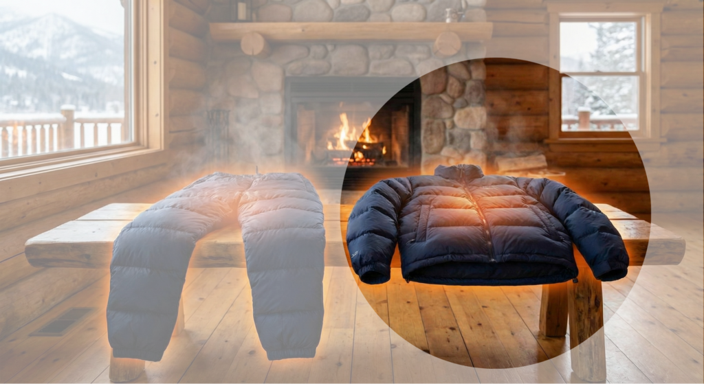ダウンは空気を閉じ込める性質があり、体温を保つための断熱効果が非常に高いです。寒冷地でも快適に過ごせるように設計されています
