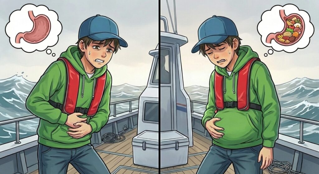 船に乗る時、「空腹」と「満腹」は、船酔いの原因になります。