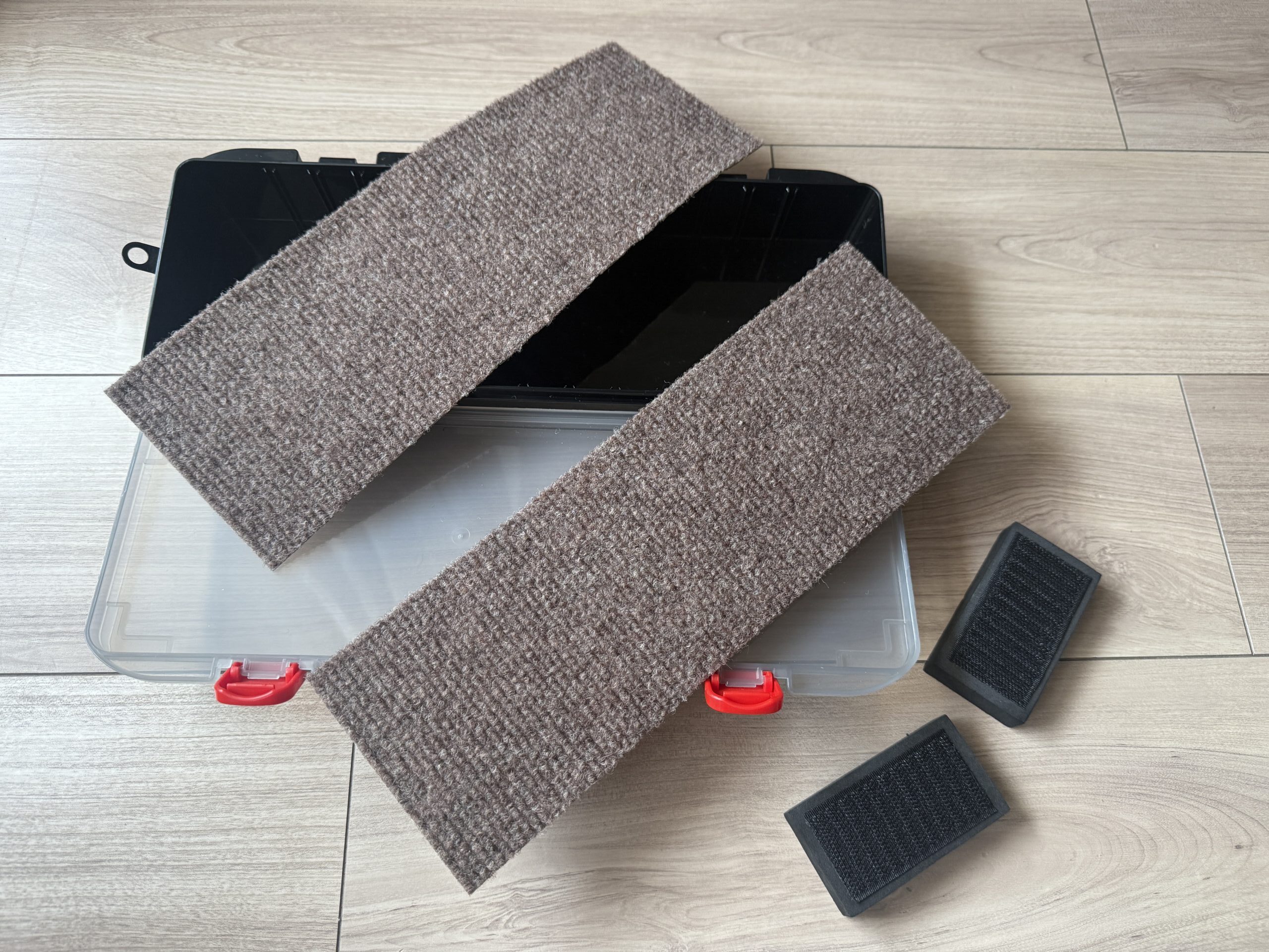 そのため、ブログ主の自作した”カットウ仕掛け専用のケース”は、ケースそのものの素材はプラスチックであっても、中にフェルト生地やスポンジを貼り付けたりして工夫してたわけです