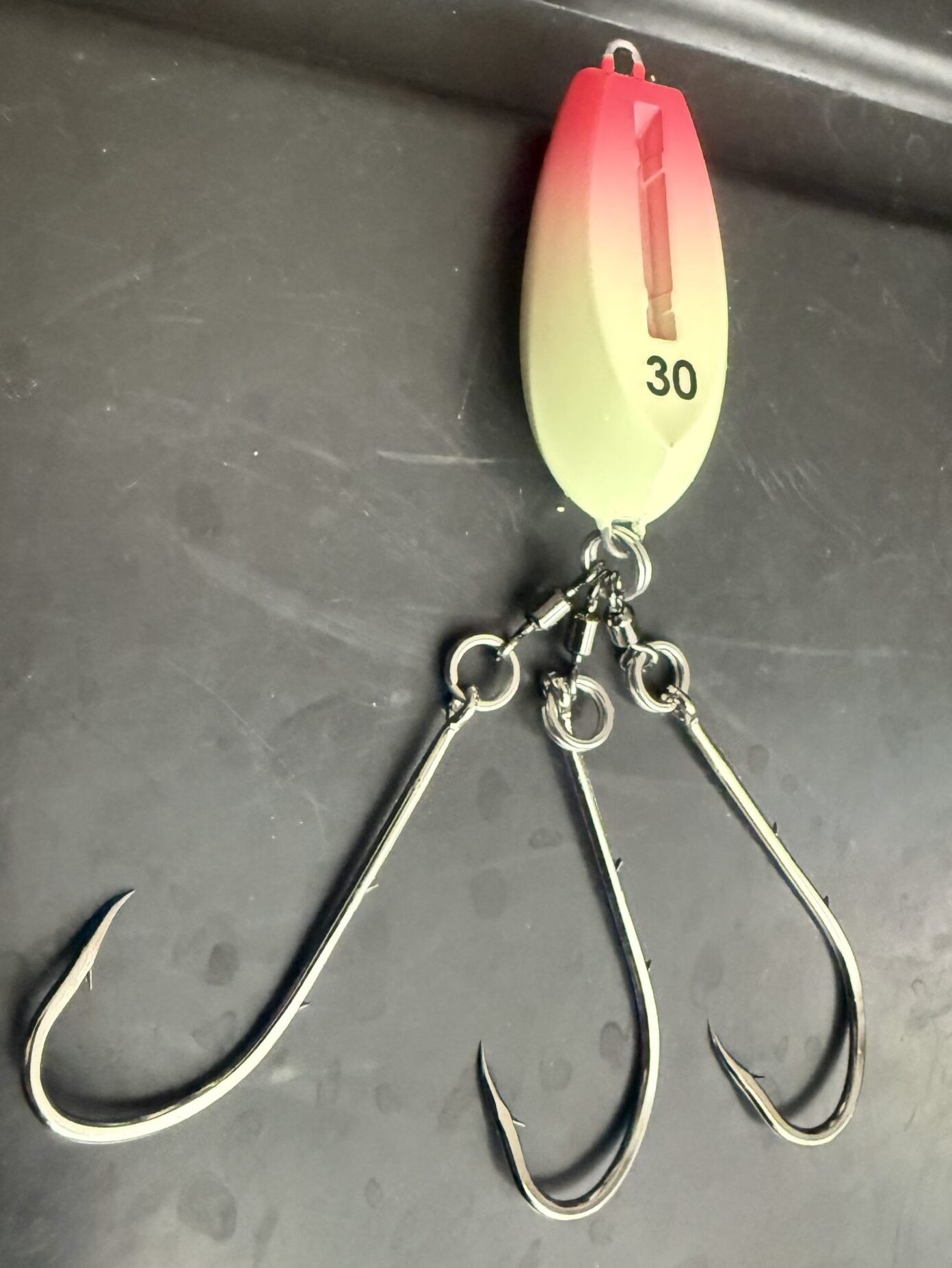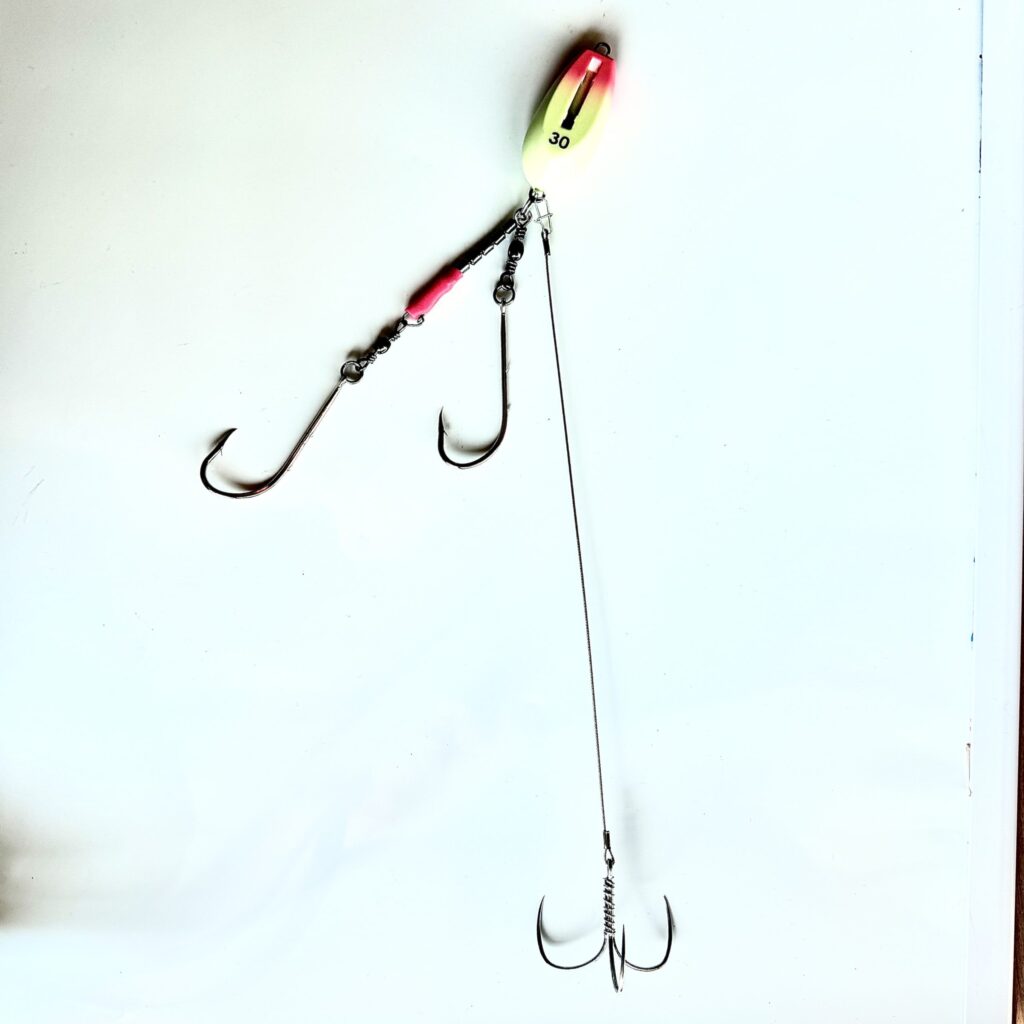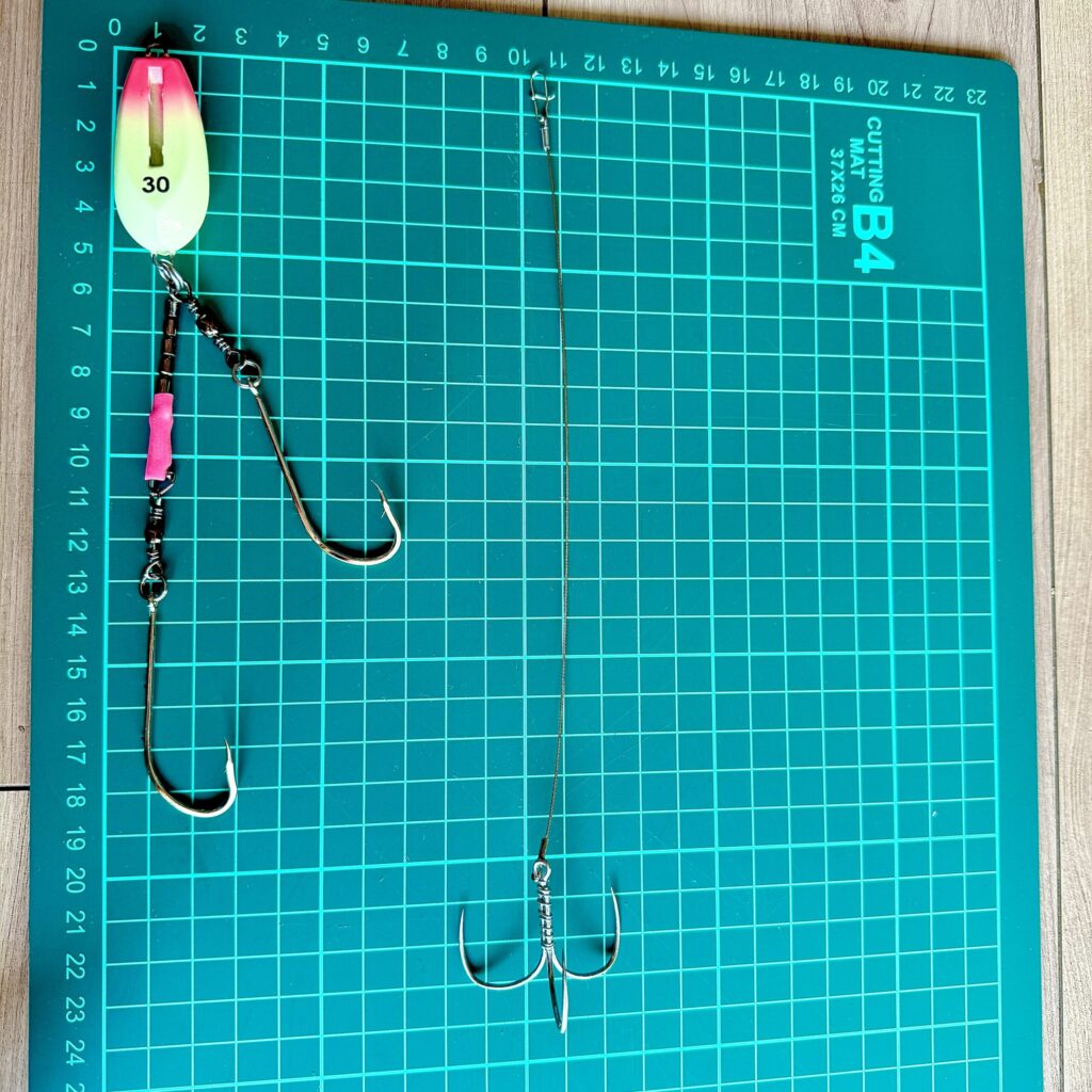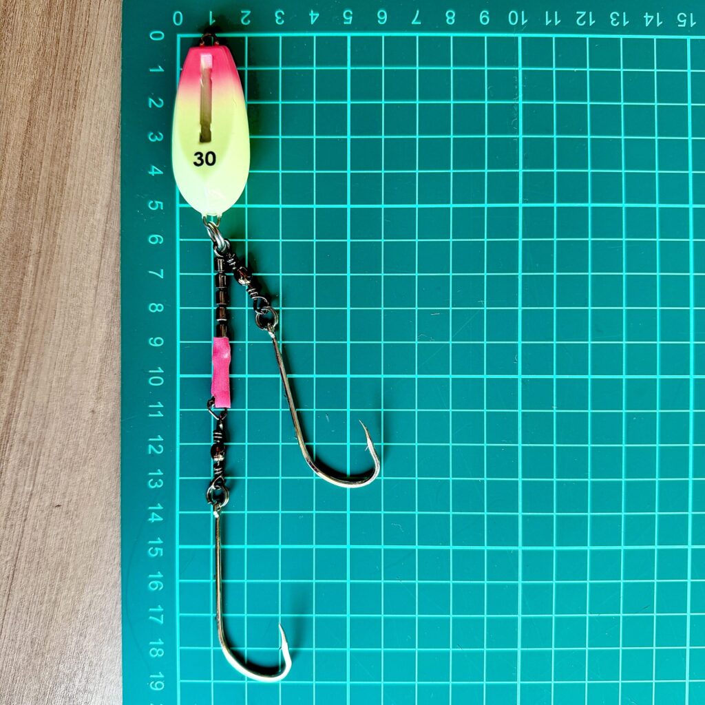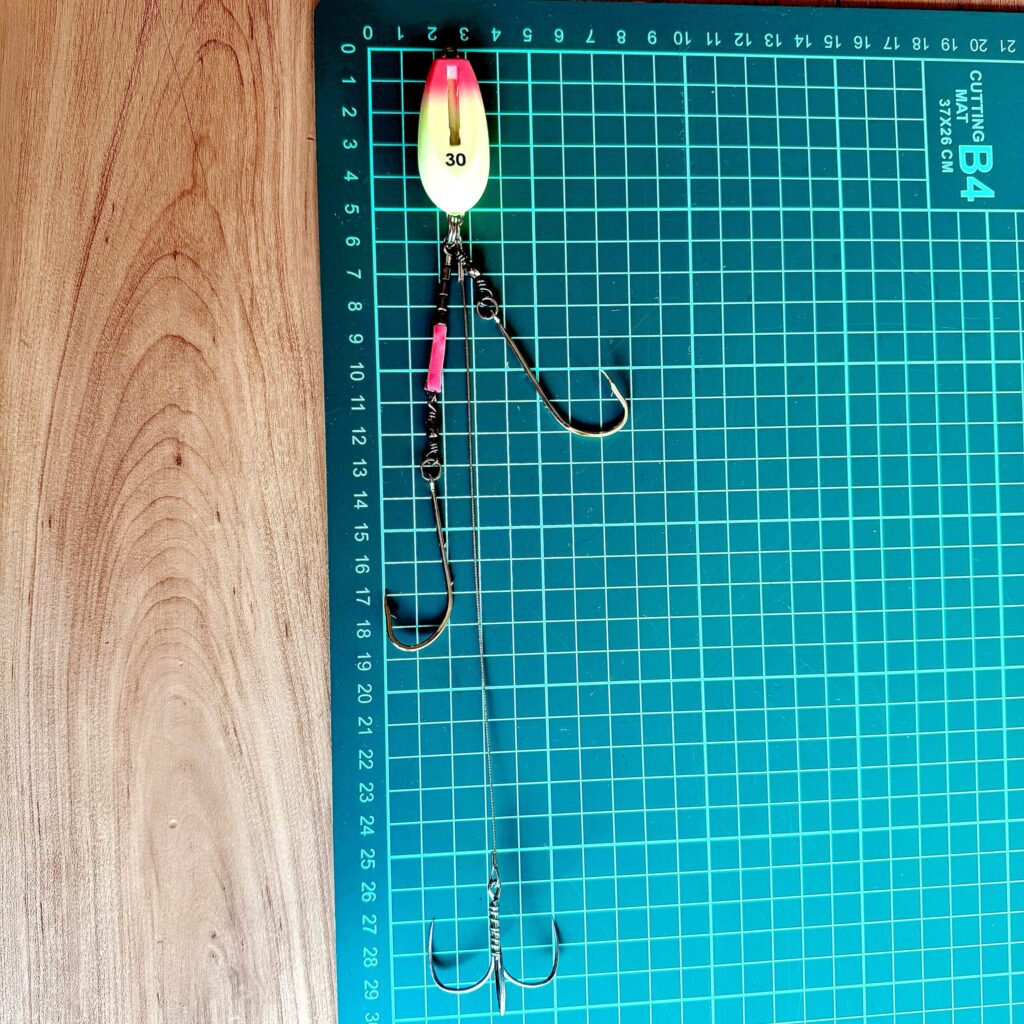 今までは、オモリ下のスプリットリングに3本全ての針を付けていましたが、