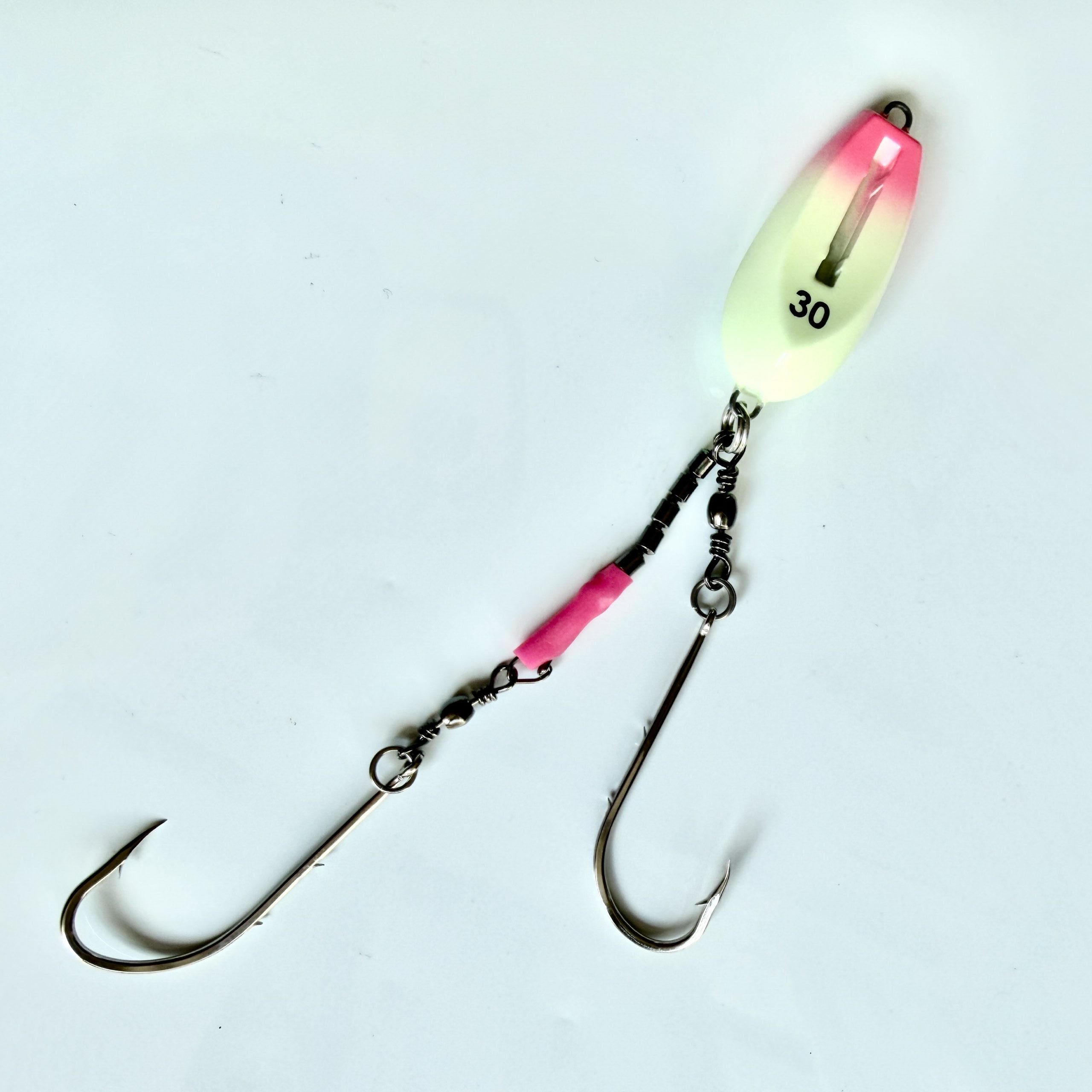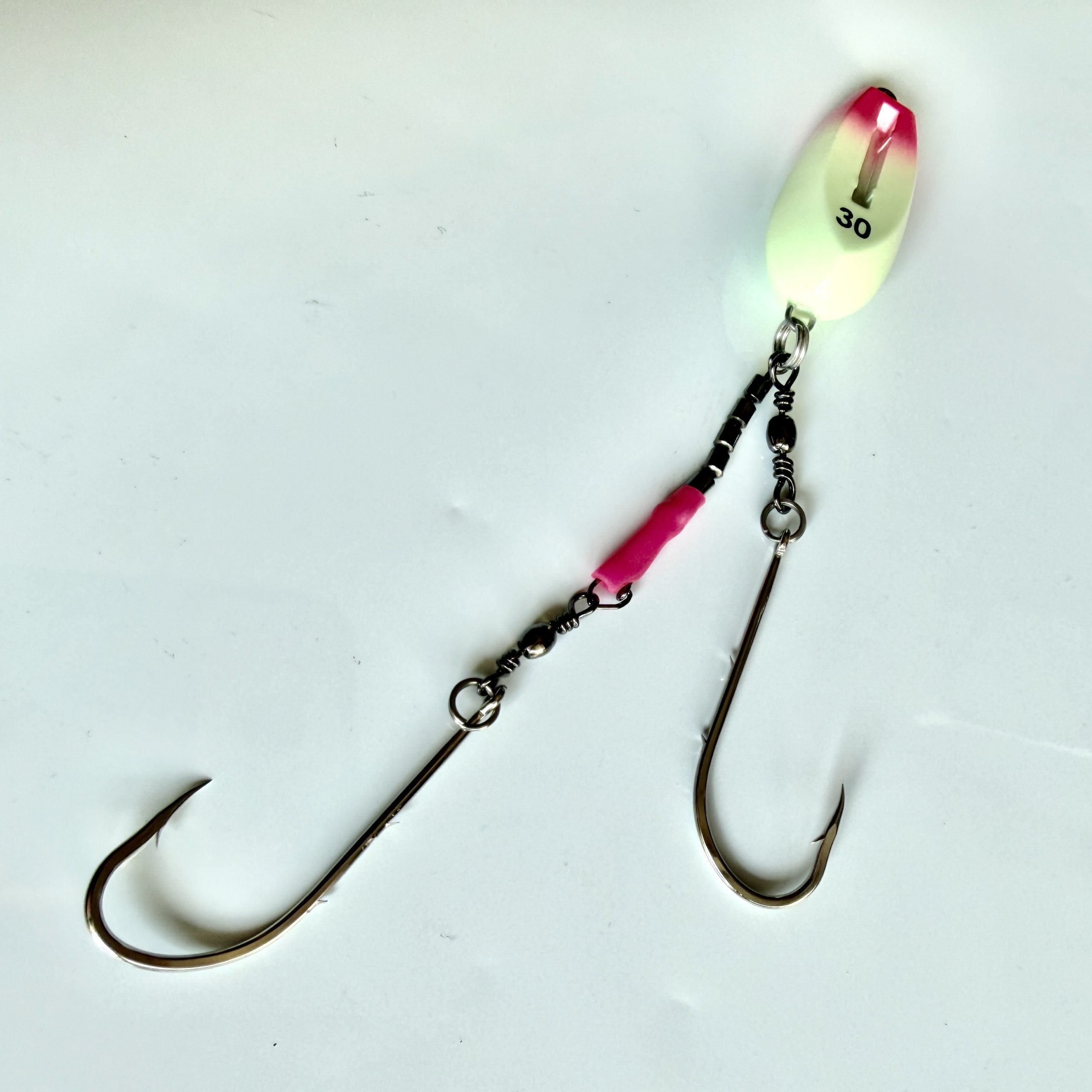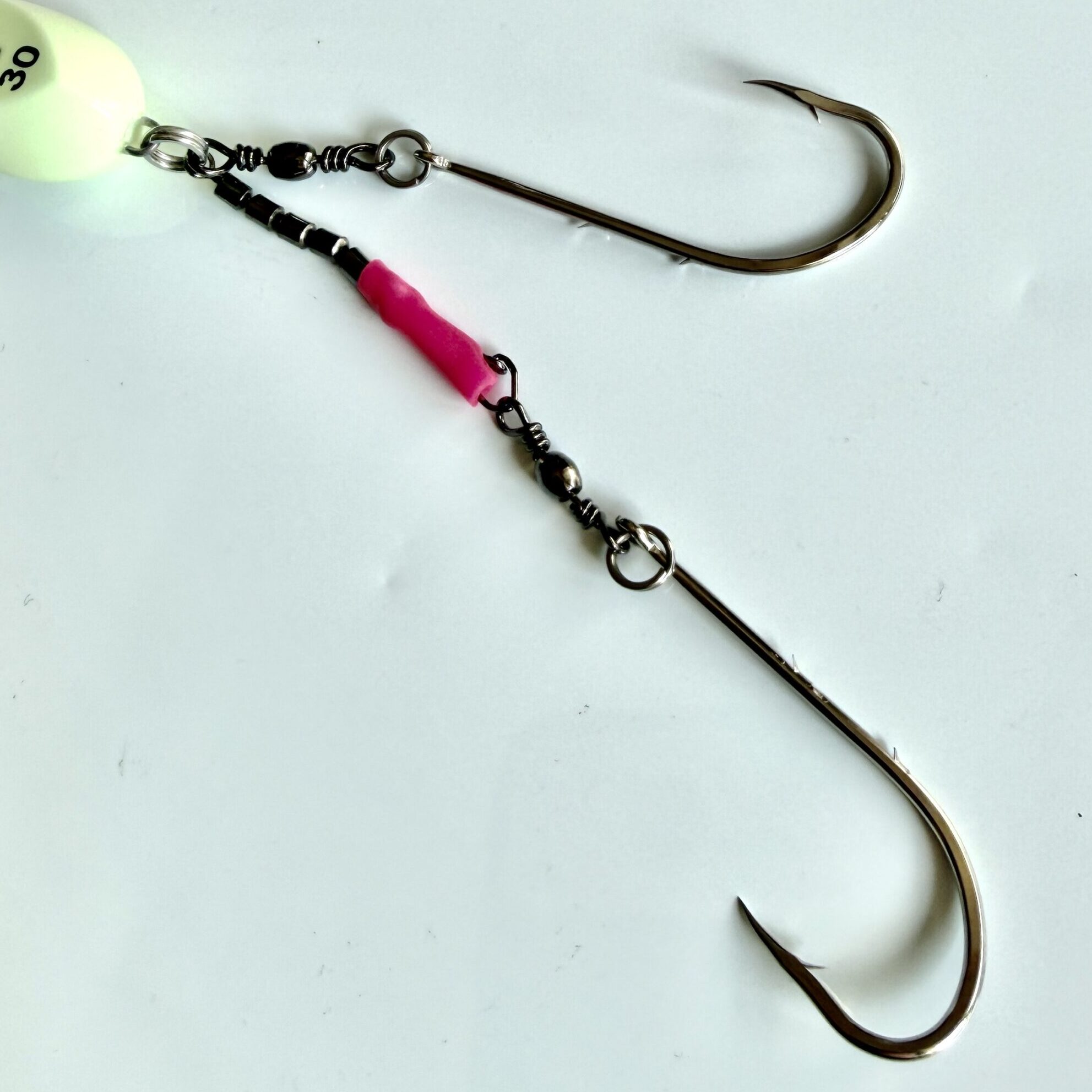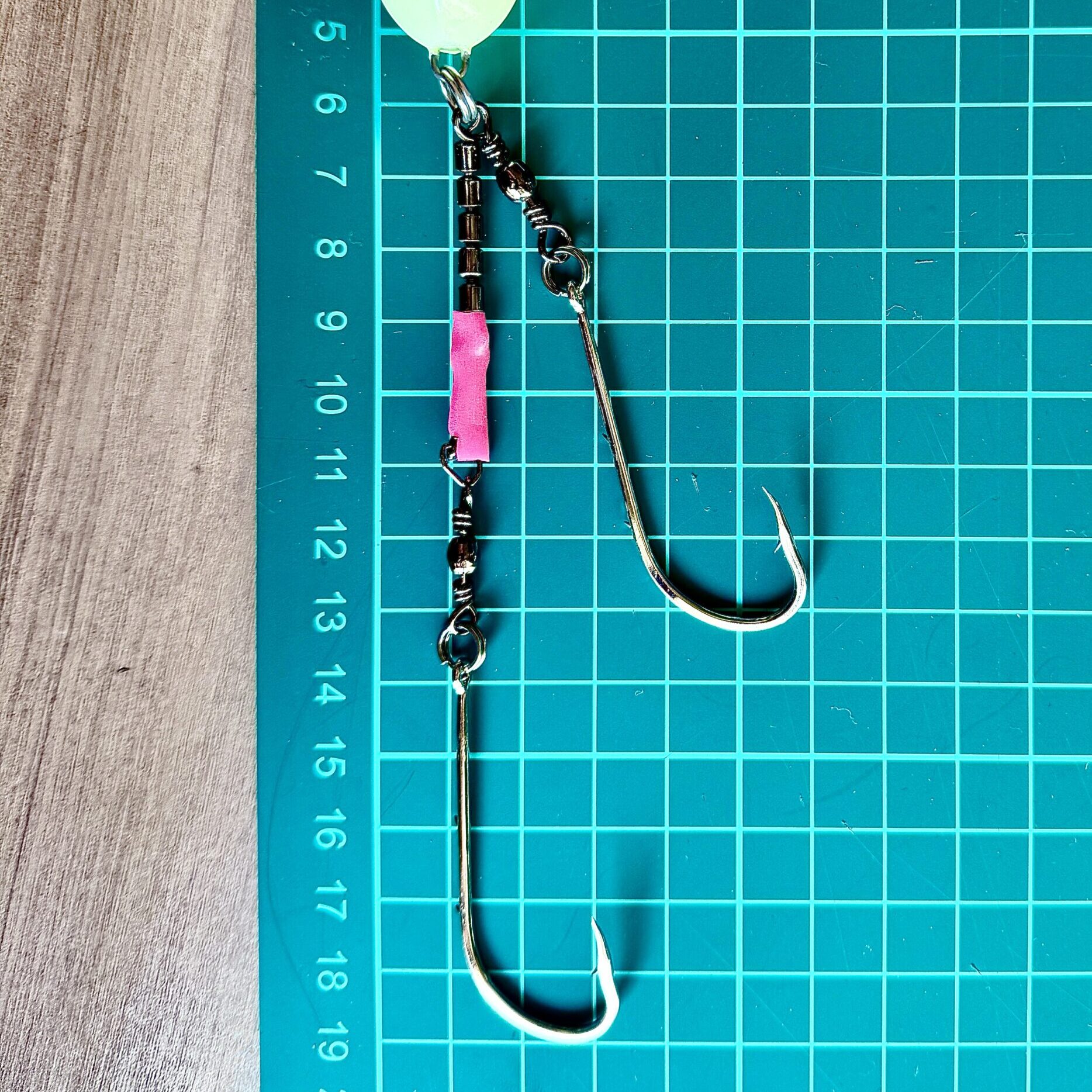 今回の新仕掛けは、1本はそのままオモリ下に付けて、もう一本は5連スイベルとスナップを付けることで、お互いが上下で段差になるようにしています